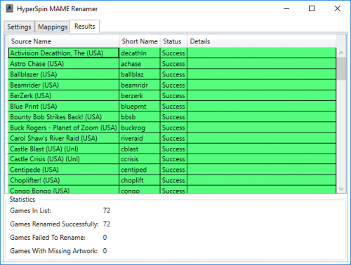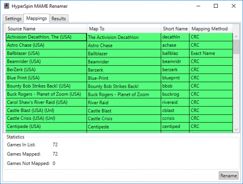 Once you are happy with the mappings, click the "Rename" button to proceed. The application will then use the mappings to rename the files. Optionally, the application can also verify that the ROM files match the CRC values in the MAME XML file as part of this process.
