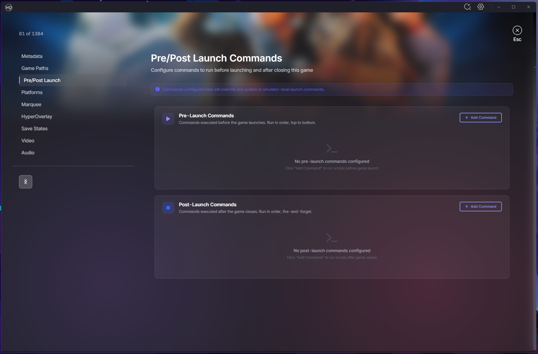 Popular Post fr0stbyt3 Posted Saturday at 11:18 PM Popular Post Posted Saturday at 11:18 PM Hey everyone! It’s been a busy stretch since our last update, and we’ve got a lot to share! This release cycle spans over 30 beta builds with hundreds of commits bringing major new features, quality-of-life improvements, and plenty of bug fixes. Whether you’re setting up a new cabinet or managing a massive collection, there’s something here for you. Let’s dive in! Emulator Settings — Per-Game Customization You can now customize emulator settings at the emulator, system, or game level with full inheritance. Override video and audio settings for specific games without touching your global config. Supported Emulators RetroArch: Video settings (VSync, Frame Delay) and Audio settings (Volume, Latency) MAME, PCSX2, Dolphin, PPSSPP, DuckStation: Emulator-specific settings Xenia, RPCS3, Cemu, Xemu, Redream: Additional emulator support How It Works Game settings override system settings, system overrides emulator, emulator overrides defaults Dynamic Video/Audio menu items appear based on emulator capabilities Config files generated on launch — your original emulator configs stay untouched Save State Management A completely new way to manage and launch from your save states. Save State Browser: View all save states grouped by core and ROM in system settings Thumbnail Previews: See what you saved with thumbnail support for RetroArch Quick Launch: Play button dropdown lets you resume from any save slot Delete Management: Clean up old save states you no longer need Emulator Support: RetroArch, PCSX2, Dolphin, PPSSPP, DuckStation, and MAME Pre-Launch & Post-Launch Commands Run custom commands before or after launching games — perfect for scripts, controller profiles, lighting setups, or anything else your setup needs. Three-Level Configuration: Set commands at emulator, system, or game level Drag & Drop Ordering: Reorder commands with visual feedback Rich Variable Support: %system.name%, %system.path%, %rom.folder%, %rom.fileExtension%, %emulator.name% Unsaved Changes Warning: Never lose your work when navigating away Play Time Tracking Know how much you’ve played each game. Total Play Time: Tracked per game (e.g., "2h 30m") Last Played: See when you last played and how many times Crash Recovery: Sessions persist even if HyperHQ closes unexpectedly System Media Details Page A dedicated page for browsing all your system media in one place. Gallery View: Filter tabs for All, Media, Images, Documents, Themes Interactive Preview: Click any artwork or video to preview it instantly Built-in PDF Viewer: Read system manuals with zoom and page navigation Floating Audio Player: Listen to system music while browsing EXIF Metadata: View Title, Keywords, Credit, and Notes in the lightbox CBZ Manual Viewer A beautiful new way to read your game manuals in CBZ format. 3D Page Flip: Animated page turns with smooth transitions Two-Page Spread: Toggle between single page and spread view Zoom Controls: Keyboard shortcuts (+/- and Ctrl+wheel) Keyboard Navigation: Arrow keys, space, and escape Accessibility: Respects reduced motion preferences ROM Path Migration Moving your ROM folders? HyperHQ can update your database automatically. Automatic Detection: When you change a system’s ROM path, HyperHQ offers to scan for matches Batch Updates: All matching ROM paths updated in your database Multi-Disk Support: Handles multi-disk ROMs correctly Progress Display: Real-time feedback during migration Wheel Manager Improvements Complete overhaul of the wheel management experience. Keyboard Navigation: Arrow keys flow through the entire tree seamlessly Reordering Controls: On-screen buttons and Ctrl+Arrow shortcuts Sort by System Type: Organize systems by category then alphabetically Group by System Type: Create collections for each category automatically Smooth Animations: Visible slide effects when moving items Collections in Systems Grid Your collections can now appear right alongside your systems. Toggle Button: Show/hide collections in the systems grid Mixed View: Collections and systems sorted alphabetically together Visual Distinction: COLLECTION badge with item count on hover Keyboard Navigation: Arrow keys work across combined list Group Systems by Type Organize your systems list by category. Category Groups: Arcade, Consoles, Computers, Handhelds, and more Category Headers: Show system count for each group Persistent Setting: Your preference saves between sessions Auto-Import Systems HyperHQ can automatically detect and import system folders from your Games directory. Startup Scan: Detects unimported system folders when HyperHQ launches Live Monitoring: Watches for new folders added while running Smart Matching: Case-insensitive matching to our system database Skip List: Mark folders to always ignore Media Downloads: Uses your existing preferences for imported systems Note: This feature is currently in early alpha — we’d love your feedback! EmuMovies Media Defaults Set your preferred media types once and use them everywhere. Wizard Step: Choose default video quality and media types during setup Automatic Application: Preferences apply when adding new systems Easy Management: Update defaults anytime in EmuMovies Settings Skip Option: "Skip for now" during setup if you don’t have an account Boxart Priority Choose your preferred artwork style. Style Selection: Set which box art displays first — 2D, 3D, or 2.5D Per-System Override: Configure globally or per-system Smart Fallback: Automatically shows next available style if preferred is missing Media Filter Find games based on available media. Dropdown Filter: Show only games with specific media types Find Missing Media: Great for identifying games missing artwork or videos Descriptive Tooltip: Shows which filters are currently active Unified Platforms Tab Streamlined emulator configuration. Merged Tabs: Launch Command and Platforms combined into one view Vari